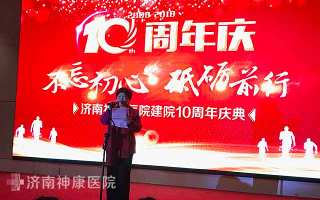庆典晚会现场,济南神康医院黄书华院长上台致开幕词。在致辞中,黄院长指出,神康医院的十年,是锐意创新、开拓进取、服务患者,取得辉煌成就的十年,这一切成就的取得,凝聚了全体员工的智慧和汗水,更离不开医院领导班子的正确领导。
